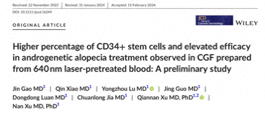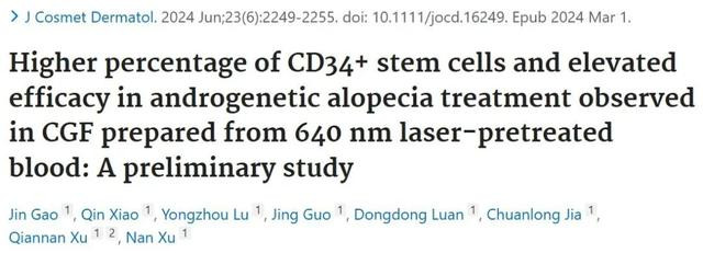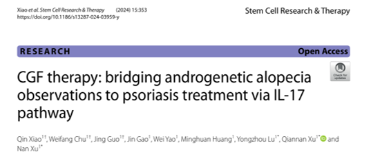 笔者研究团队证实,通过640nm激光预处理血液制备的CGF,其内CD34+干细胞数量显著增加。CD34+是干细胞的重要标志,与组织再生和修复能力密切相关。在雄激素性脱发(AGA)治疗中,该方法显示出显著优于常规CGF的治疗效果,为此类疾病的治疗提供了新方向。这一研究成果发表在Journal of Cosmetic Dermatology期刊,为CGF在脱发治疗中的应用提供了新的理论支持。此外,笔者团队发表在Stem Cell Research Therapy期刊的一项研究发现,CGF不仅能通过改善毛囊微循环有效辅助治疗AGA,还可通过调控IL-17信号通路,改善银屑病患者顽固性皮损对生物制剂治疗的反应。这些研究为CGF在皮肤病学领域的多重临床应用提供了重要支持,并显示出其跨疾病领域的广阔潜力。